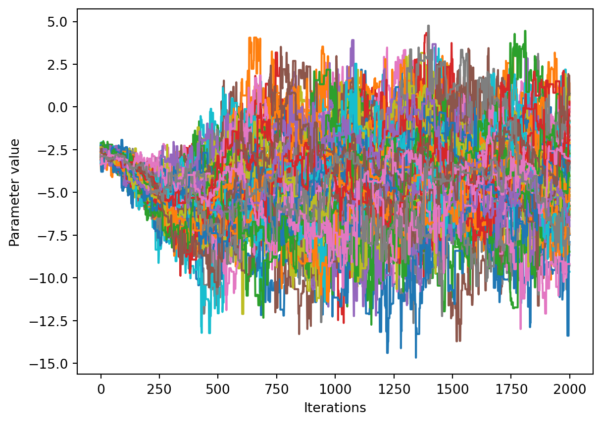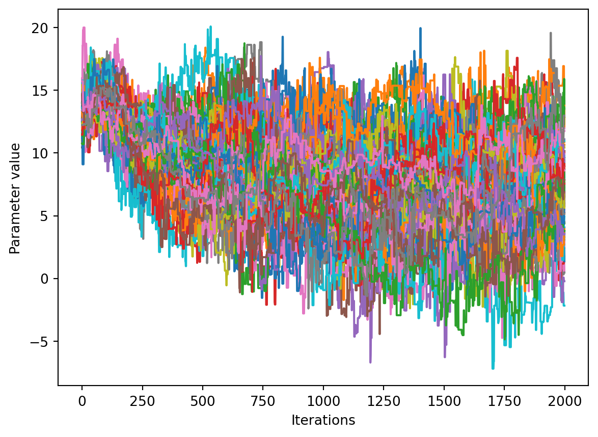 num_chains = trace.shape[0]num_parameters =3# only plot the first three parameters, for all of them use `trace.shape[2]`for parameter inrange(num_parameters): fig, ax = plt.subplots() ax.set_xlabel('Iterations') ax.set_ylabel('Parameter value')for chain inrange(num_chains): ax.plot(trace[chain, :, parameter])plt.show()