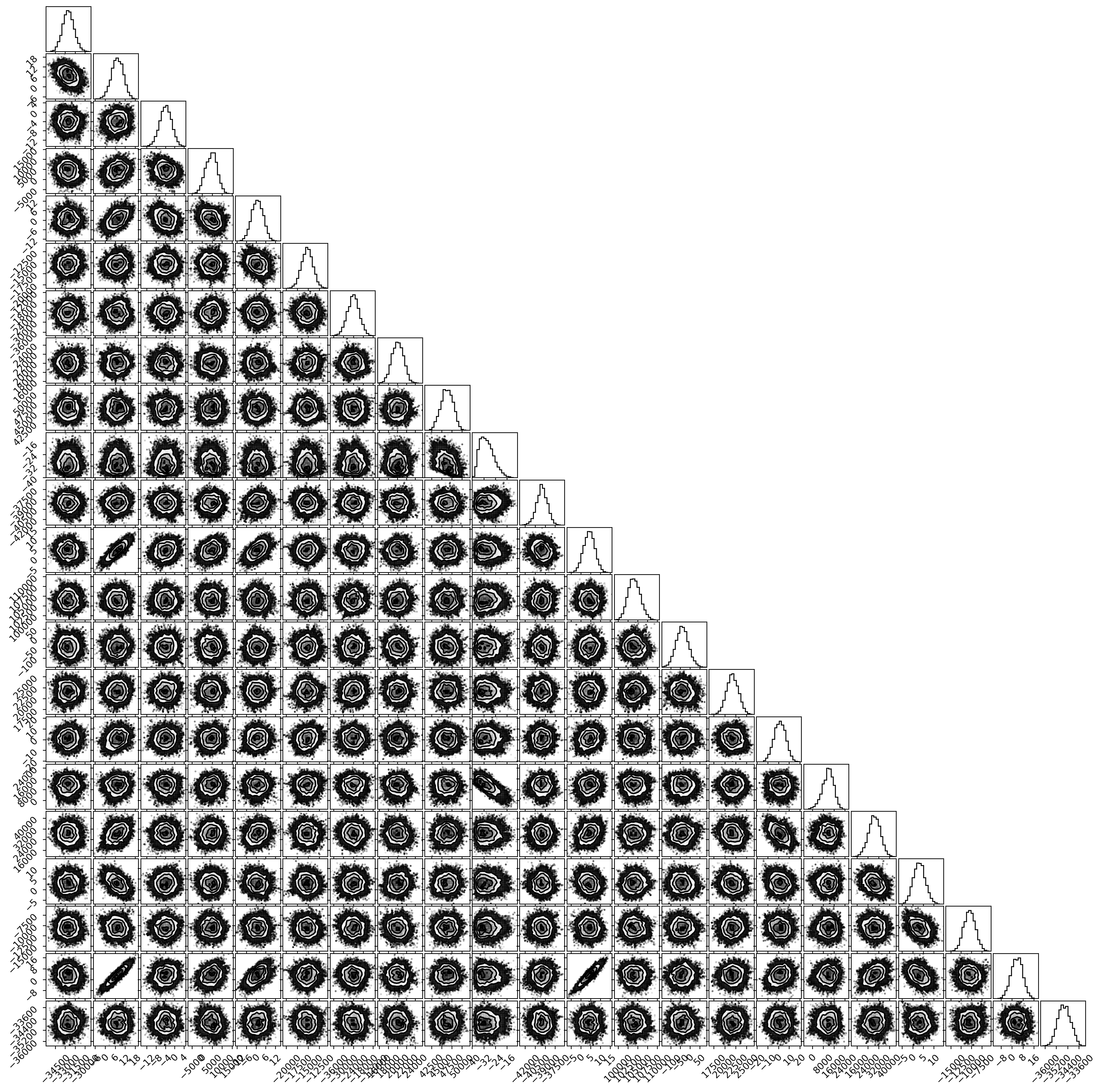 In a corner plot, the distributions for each parameter are plotted along the diagonal and covariances between them under the diagonal. A more circular covariance means that parameters are not correlated to each other, while elongated shapes indicate that the two parameters are correlated. Strongly correlated parameters are expected for some parameters in Calphad models within phases or for phases in equilibrium, because increasing one parameter while decreasing another would give a similar error.